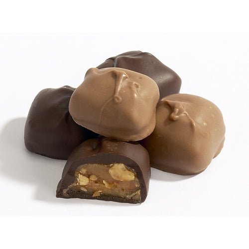 Very crunchy like buttery peanut brittle but these squares are made with fresh cashews then coated in chocolate. Milk or dark chocolate.