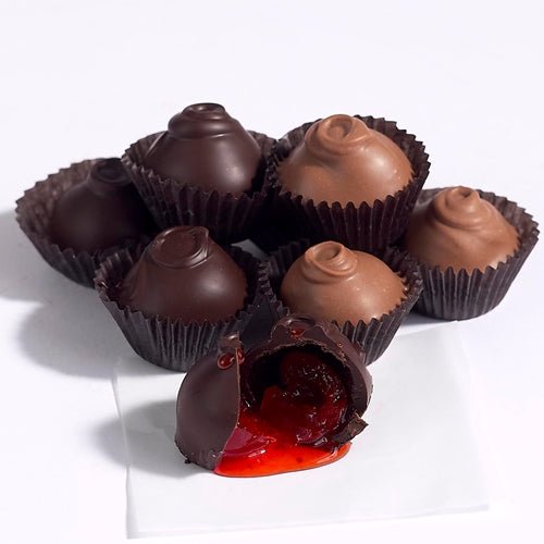 Ours are made painstakingly by hand, making these an all time favorite. Beware when biting in to the juicy maraschino cherries floating in cherry liquid. Hand dipped in either milk or dark chocolate.