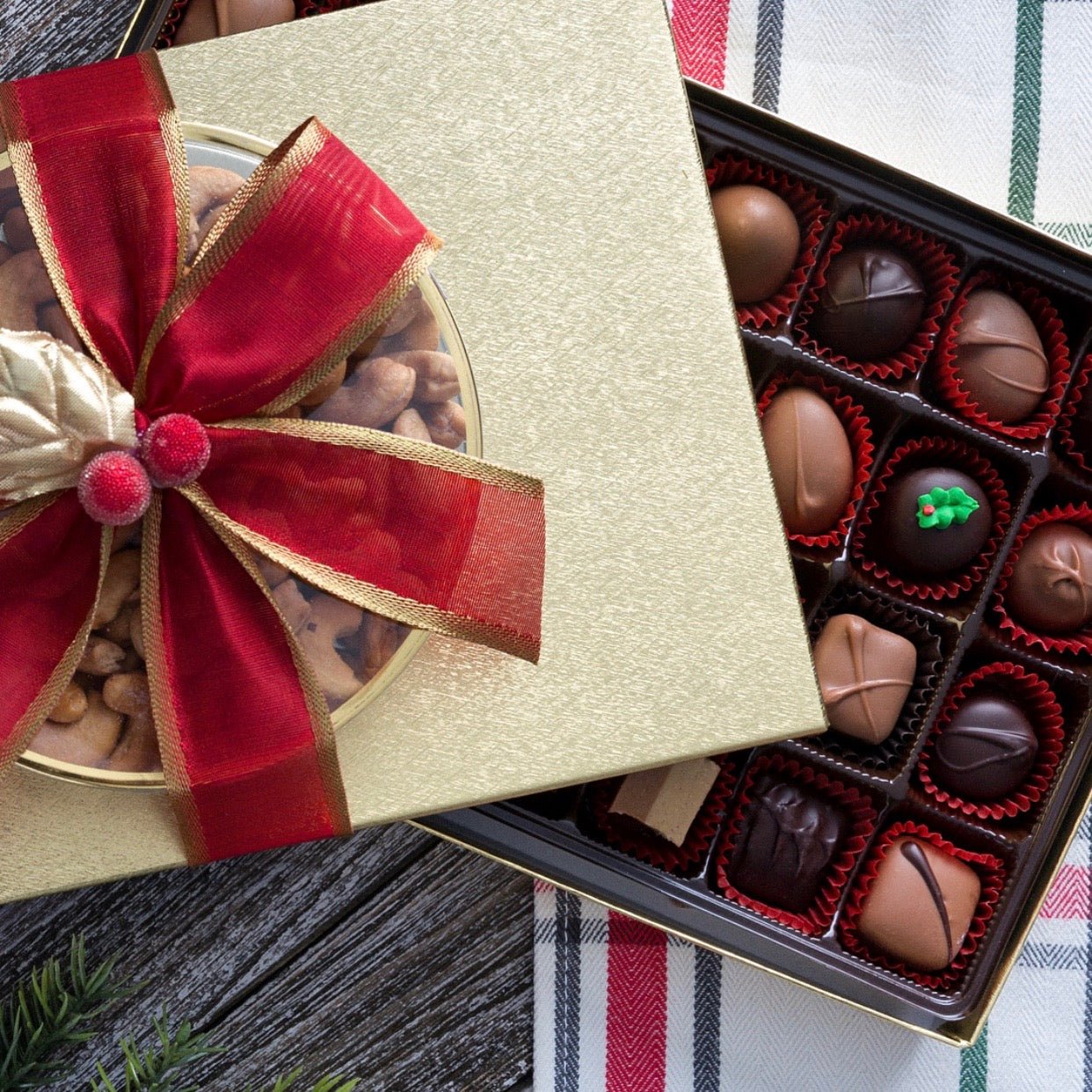 One of the most popular gifts of the season includes a 14 oz box of our Christmas Assortment of Chocolates and topped off with a clear container filled with fresh roasted cashews. The chocolates are packed in an elegant gold box and they are expertly tied together with cheerful holiday ribbon.
