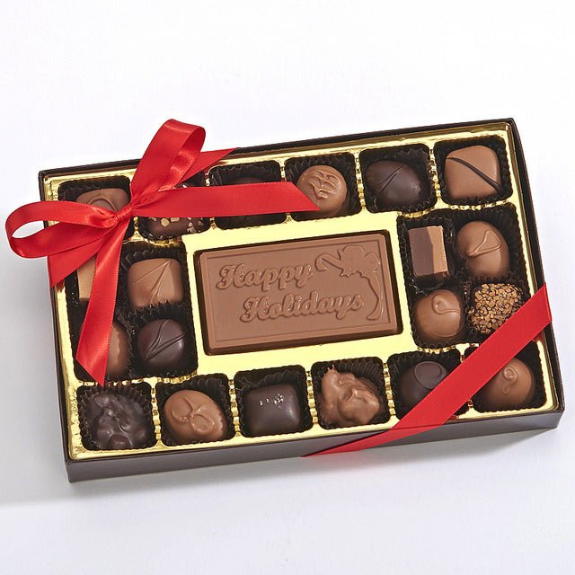 Just right for the Holidays. This attractively arranged assortment has our homemade chocolates surrounding a milk chocolate “business card”.